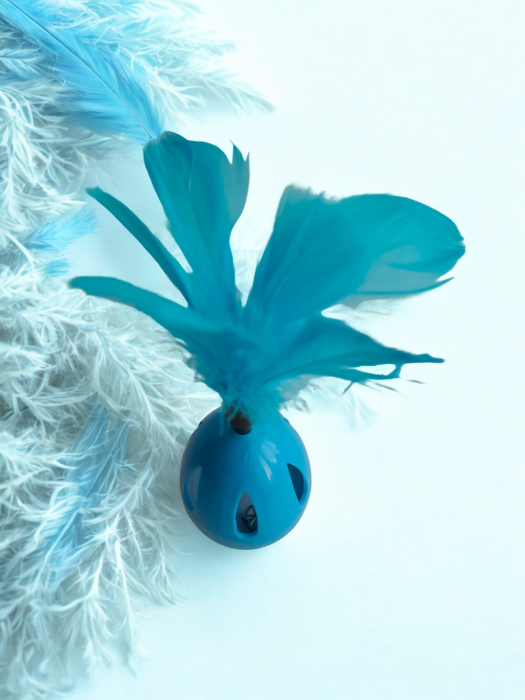 Jucărie pentru pisici tip Hopa-Mitică cu pene și zornăitor, ideală pentru joacă activă și stimulare.