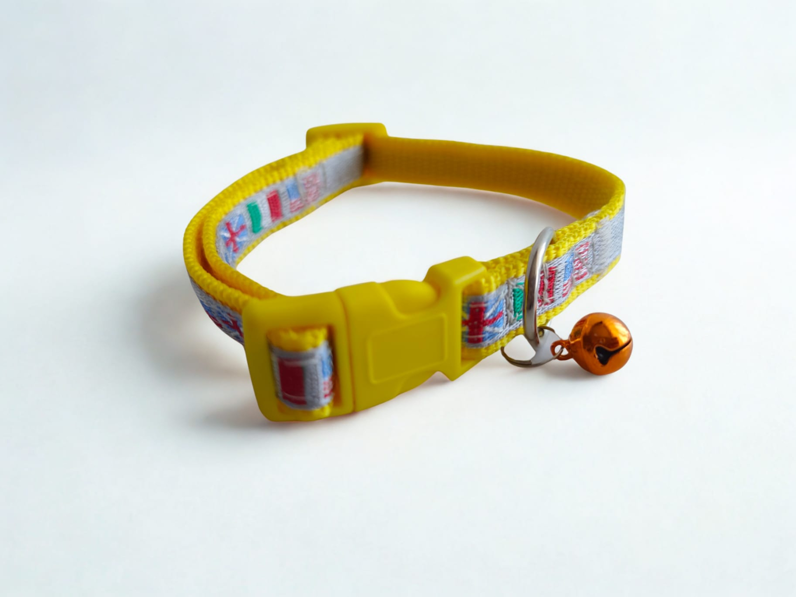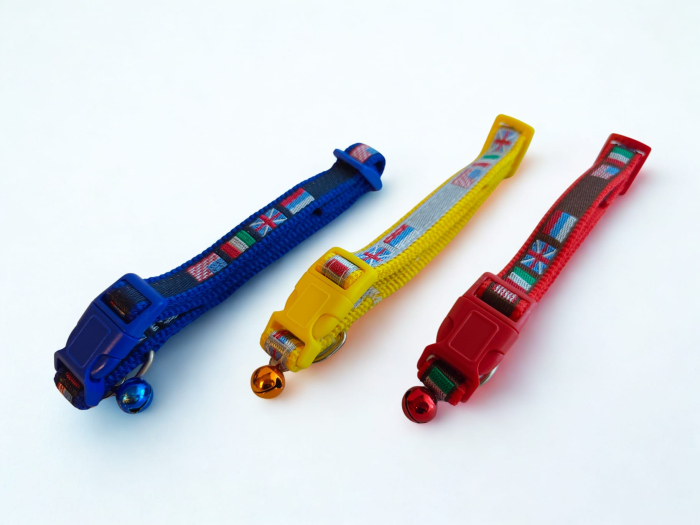 Zgarda este prevăzută cu sistem de închidere cu cataramă din plastic, ușor de ajustat, și inel metalic pentru prinderea lesei. Clopoțelul integrat oferă un plus de vizibilitate și utilitate.