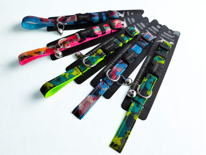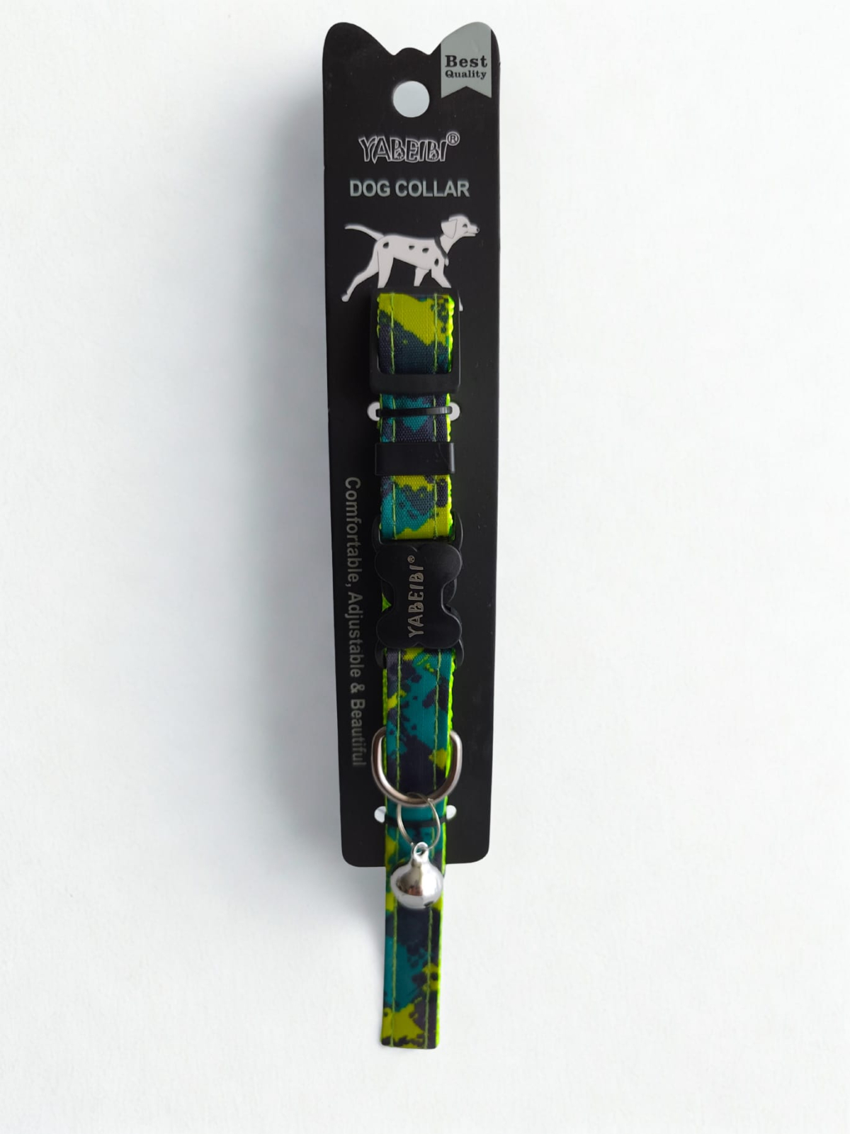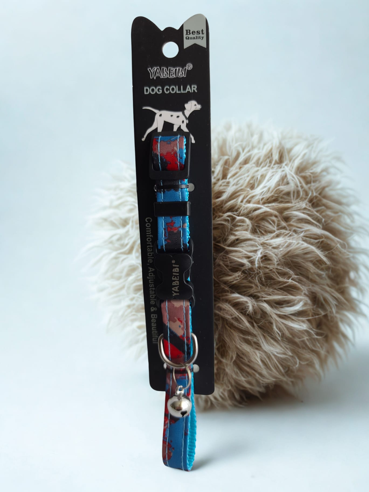 Zgardă pentru câini din nylon, reglabilă până la 40 cm, cu clopoțel și inel metalic pentru prindere.